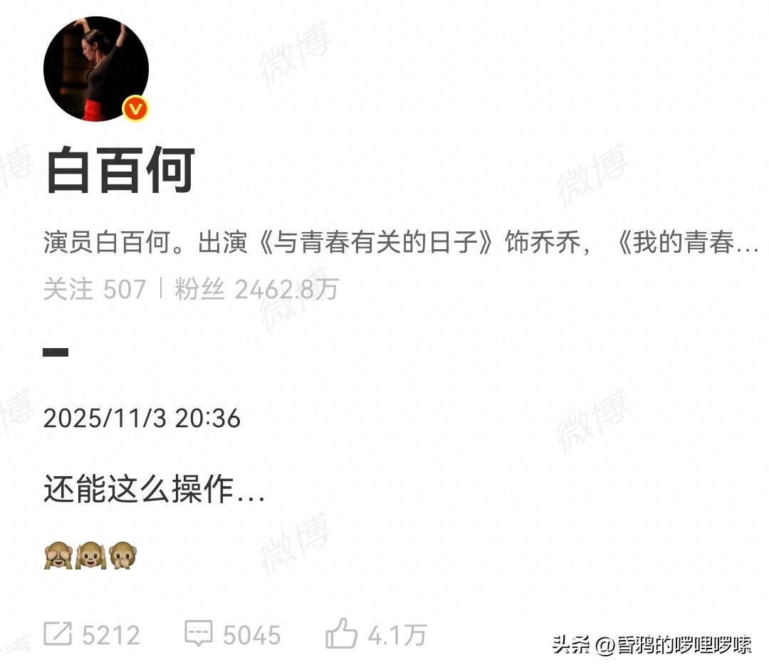 11月3日晚,演员白百何在新浪微博发布了仅有七个字的内容:“还能这么操作